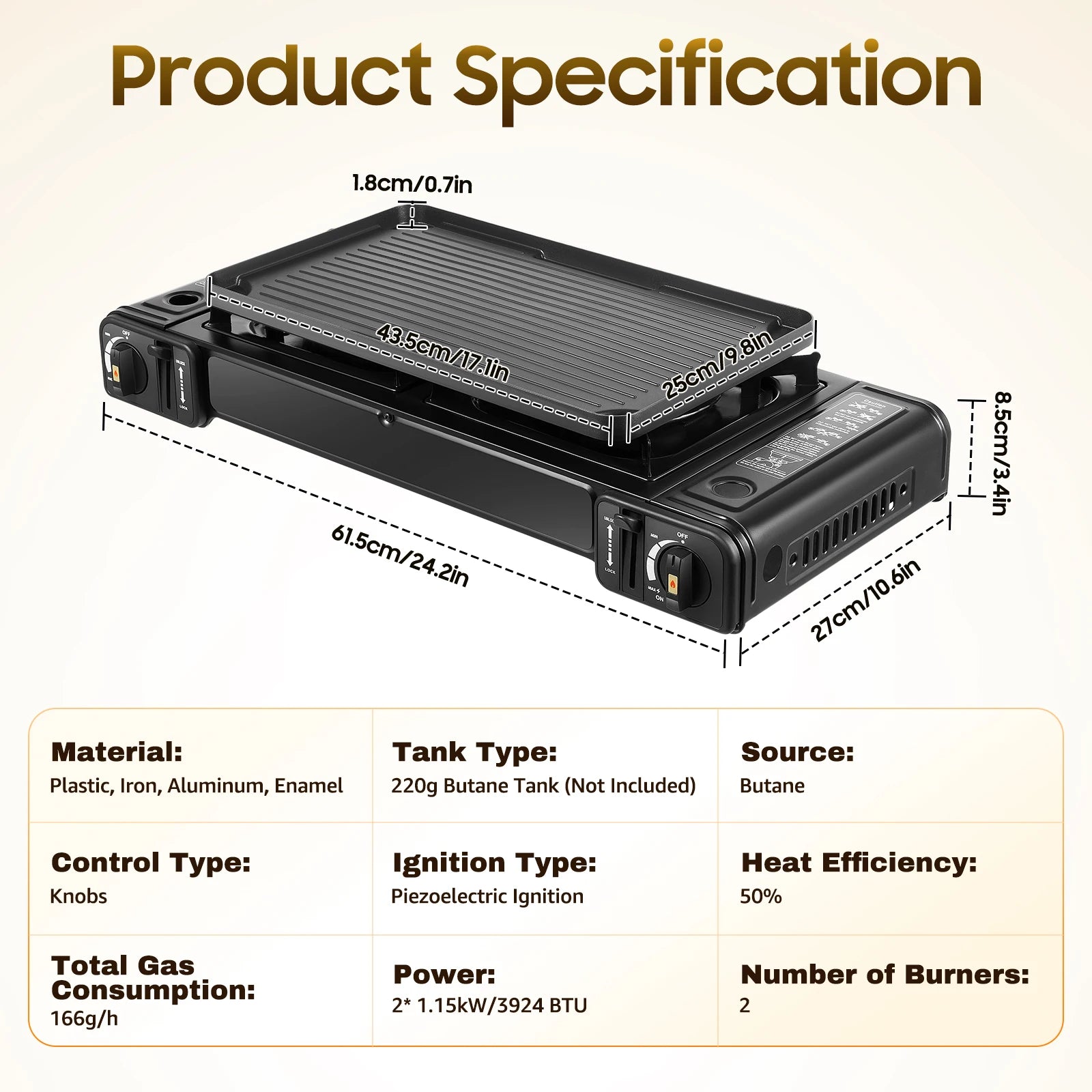 Don't miss out on the convenience and functionality of the 2-in-1 Portable 2-Burner Butane Camping Stove Kit. Whether you're a seasoned adventurer or just starting your outdoor journey, this stove is guaranteed to enhance your cooking experience. Order now and elevate your outdoor cooking game!