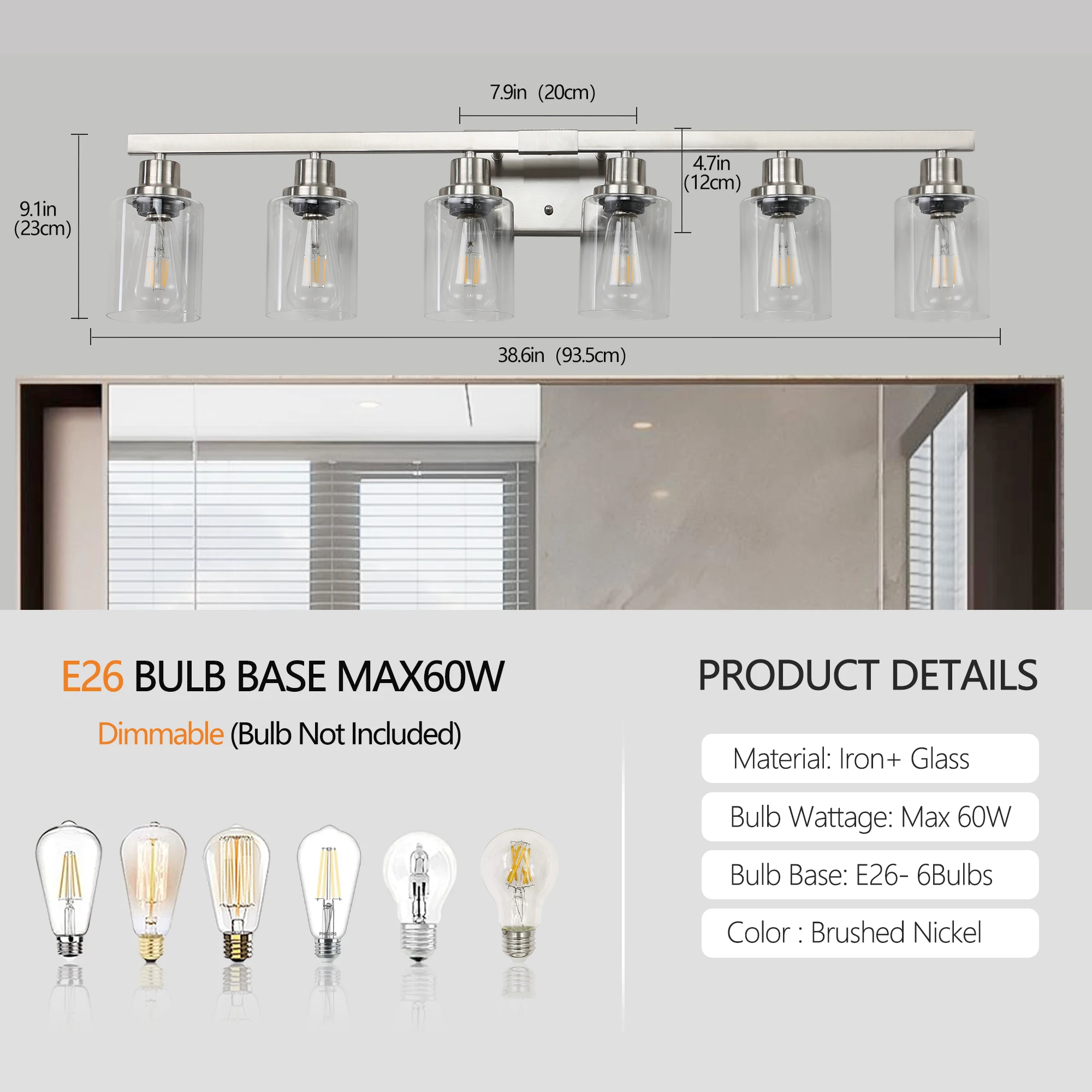 6-Light Bathroom Vanity Light, Industrial Black/Brushed Nickel/Golden Metal Fixture with Clear Glass Shades, Wall Mount Mirror Lighting for Bathroom (Bulbs Not Provided)