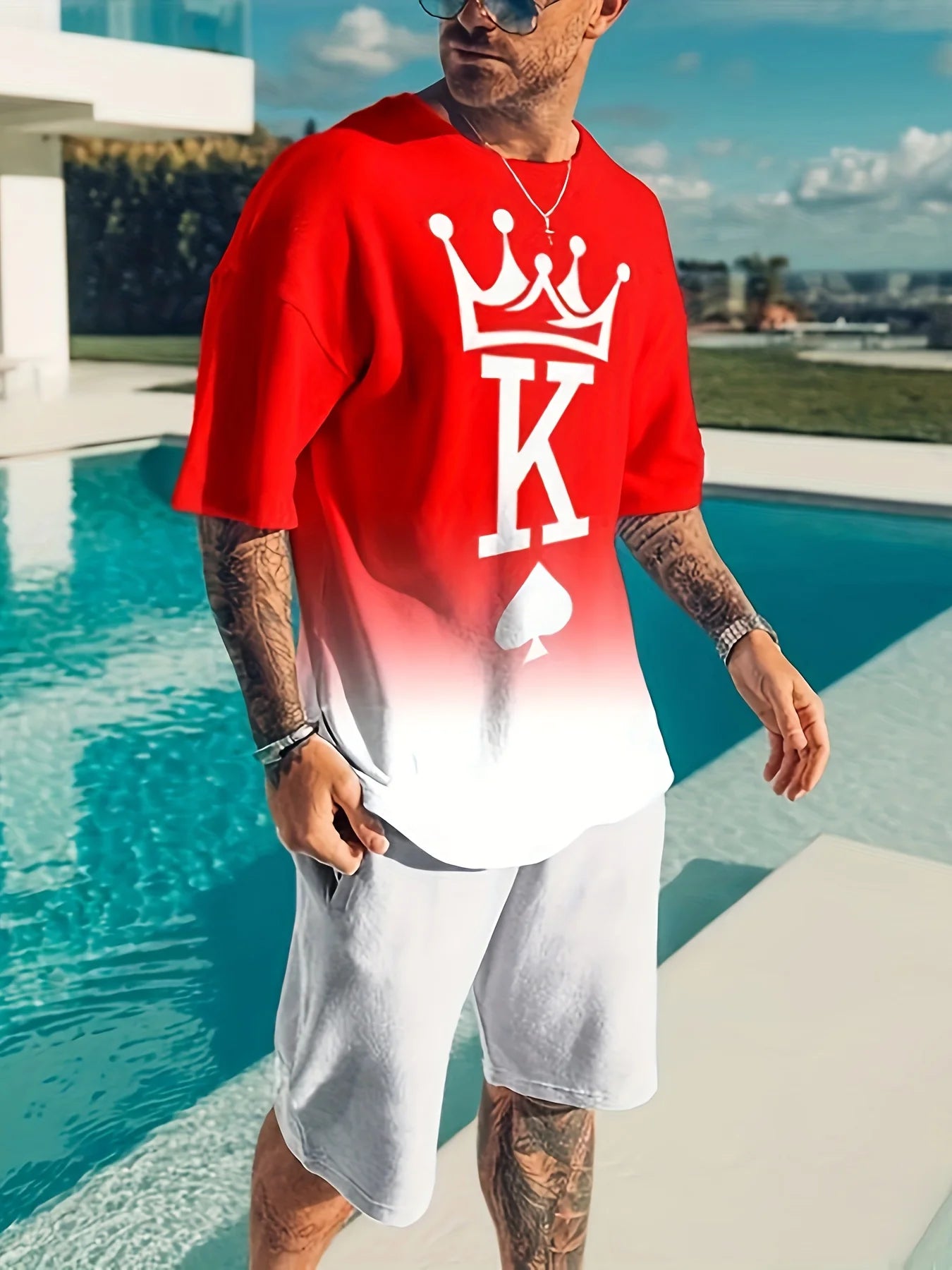 Men's Trendy Round Neck Short Sleeve Two Piece Suit with 3D Digital Print for Summer