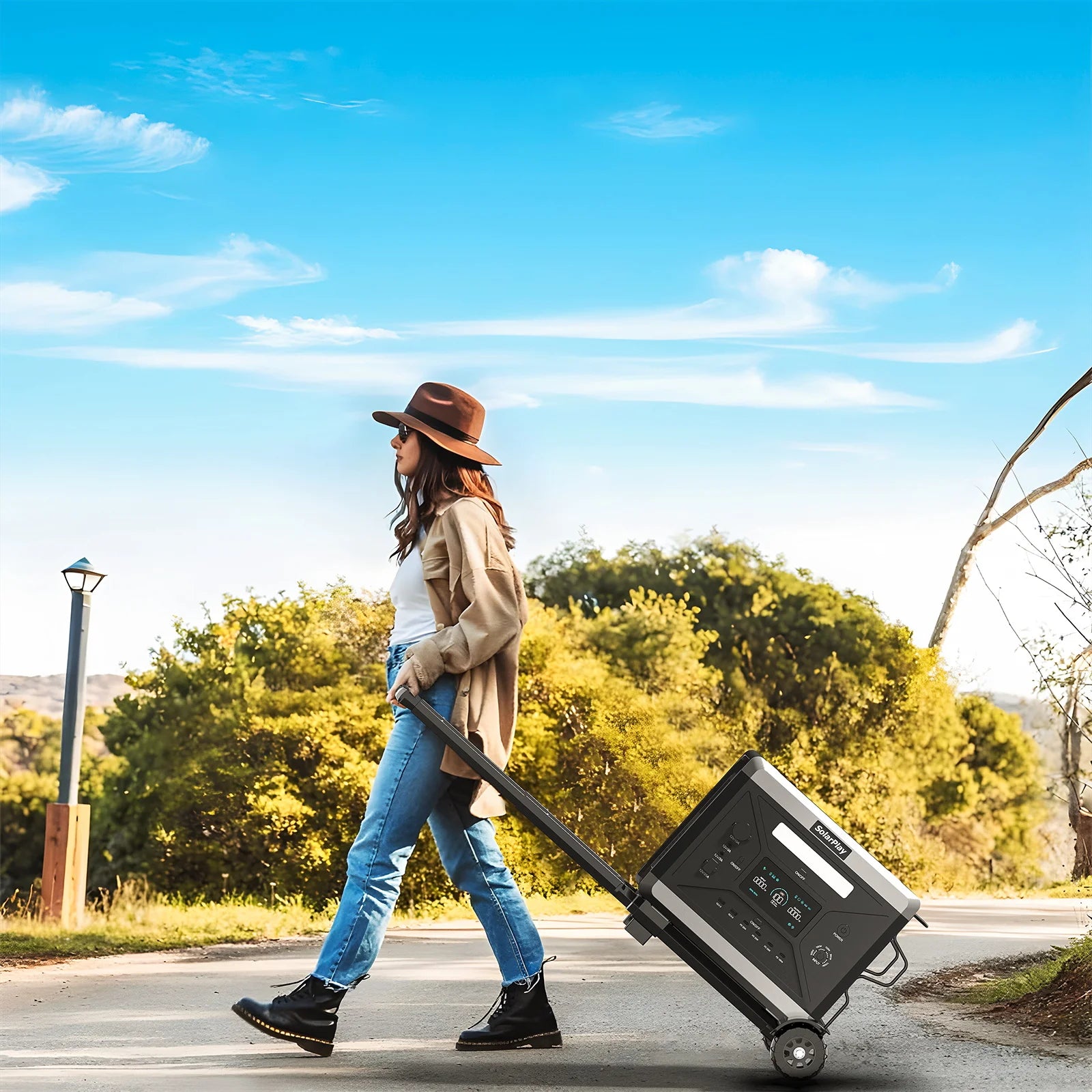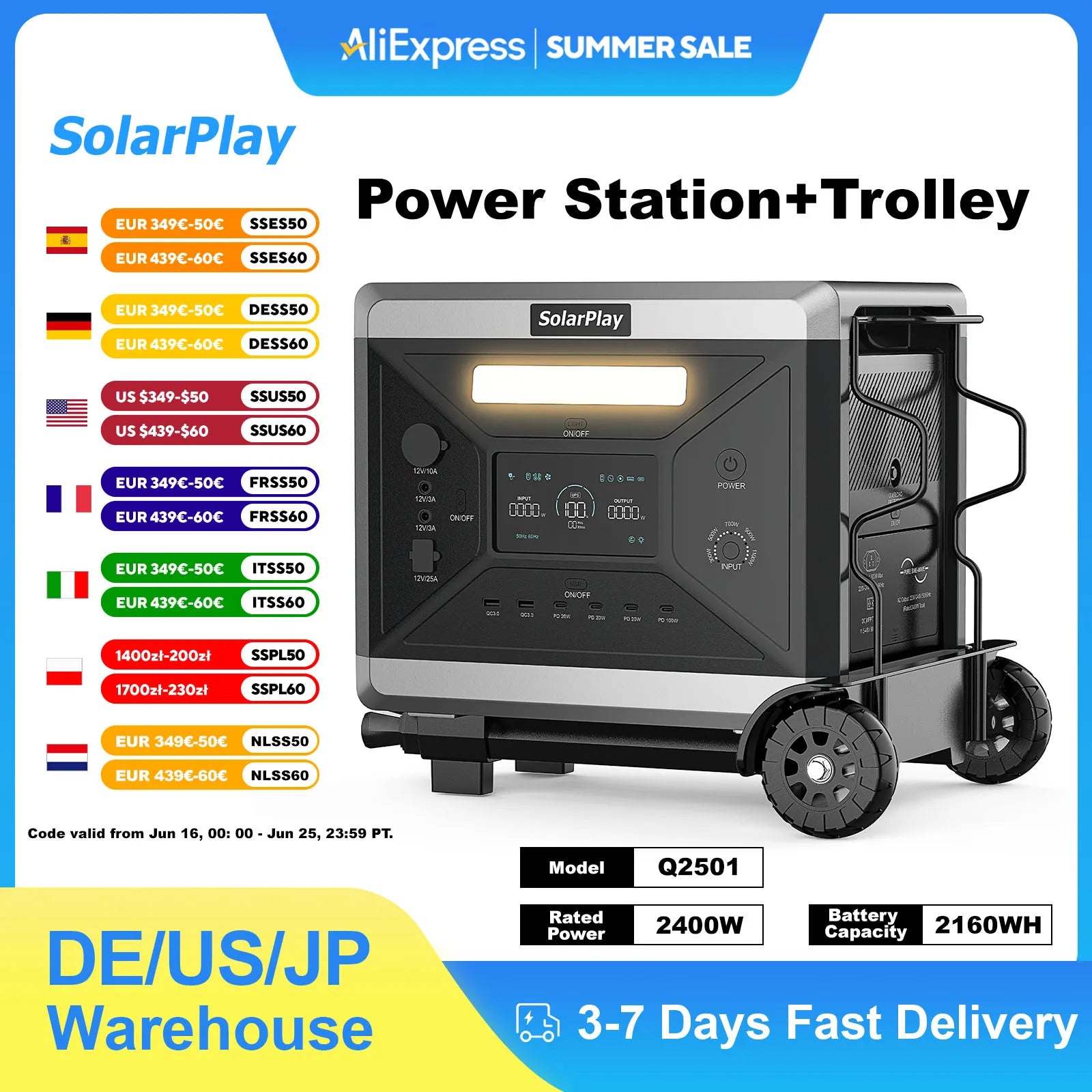 SolarPlay Q2501 Portable Power Station 2400W LiFePO4 Battery UPS with Trolley for Camping