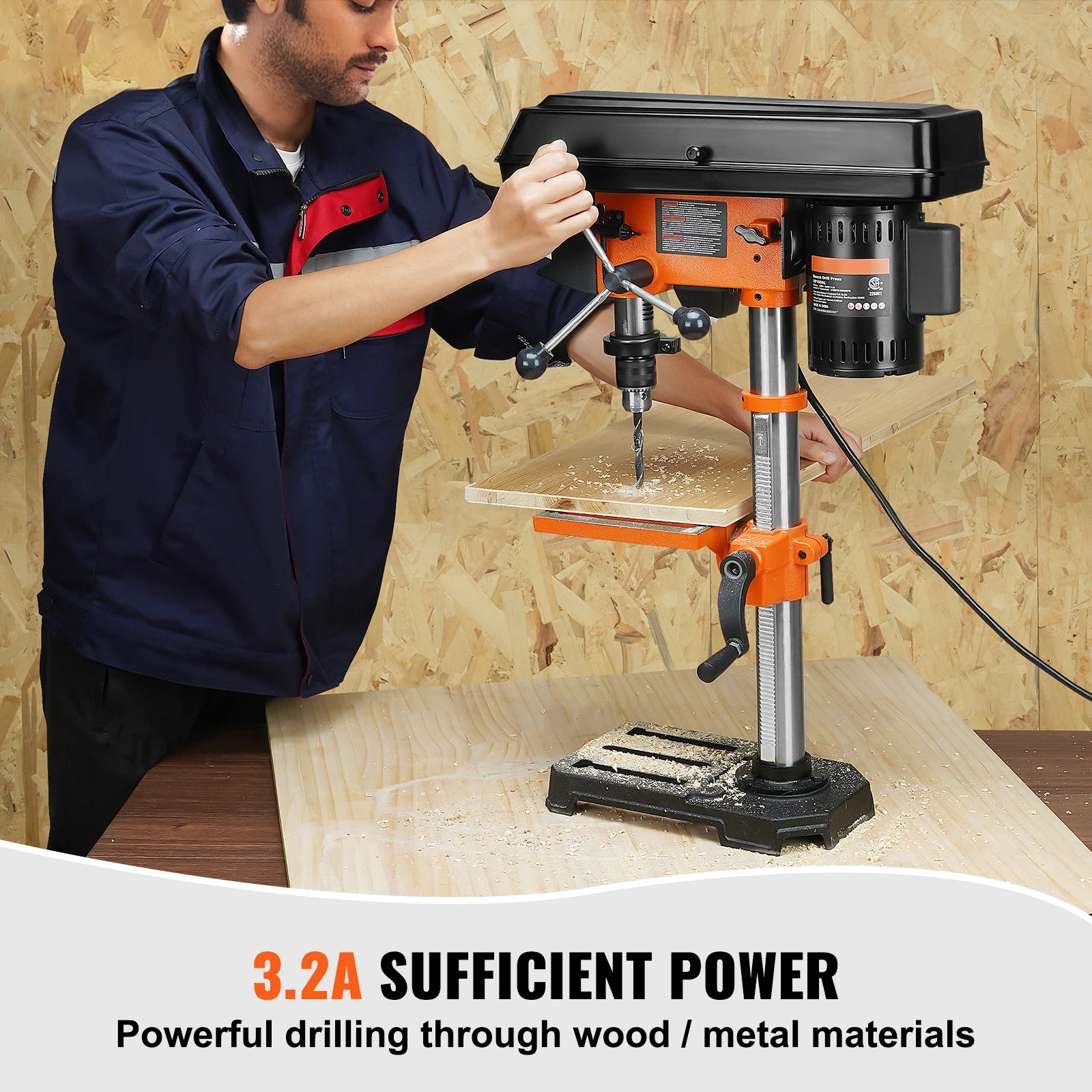 5-Speed Versatility This bench drill press offers five adjustable speed settings, allowing you to effortlessly switch between 610 and 2800 RPM (options include 610, 900, 1500, 2080, and 2800 RPM) to match various drilling tasks. Durable Construction Engineered with an efficient heat dissipation system, this drill press minimizes overheating, ensuring longer operational life and consistent performance. Robust Power Source The 3.2A induction motor delivers significant power for drilling through a range of materials, including wood and metal, effectively supporting your DIY projects and processing needs. Accurate Drilling Designed for precision, this benchtop drill press produces accurate holes without misalignment, featuring a strong locking mechanism for enhanced stability during use. Comprehensive Accessory Set Included with the drill press are essential accessories: 2 hex wrenches, a table assembly, a base, a column assembly, a table crank handle, 3 M8*16 hex bolts, 3 feed handles, a worm gear, a table lock handle, a chuck, and a chuck key, ensuring you have everything needed for setup and operation.